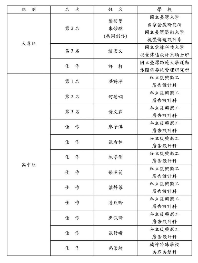 每组 遴選前三名各一位,贈送獎金及獎狀: